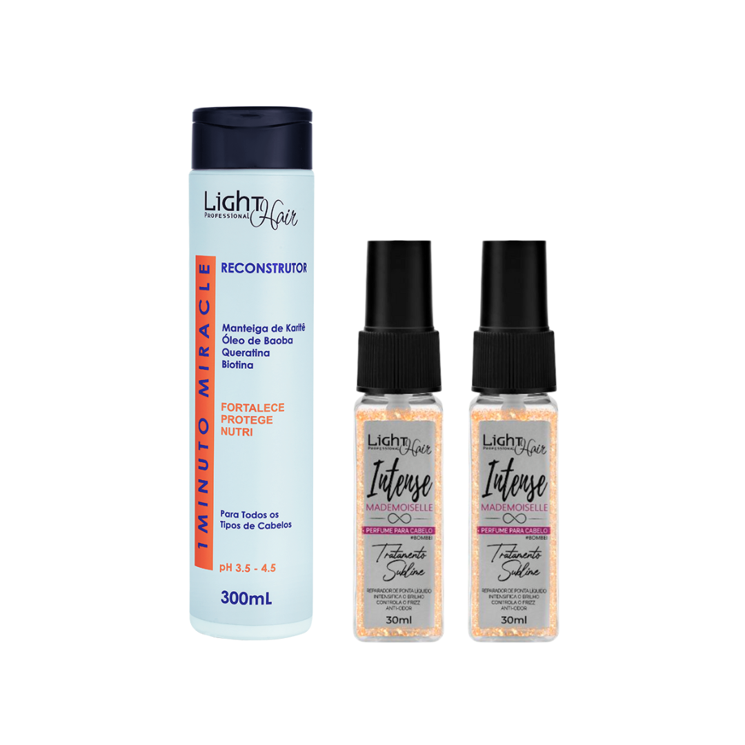 Reconstrutor 1 Minuto Miracle Manutenção: Após lavar os cabelos com shampoo, aplique o reconstrutor nos fios úmidos, distribuindo uniformemente. Deixe agir por 1 minuto e enxágue bem. Perfume de Cabelo Mademoiselle: Agite o frasco antes de usar. Pulverize sobre os cabelos secos ou úmidos após escovar ou pranchar para dar brilho e um perfume suave e duradouro.