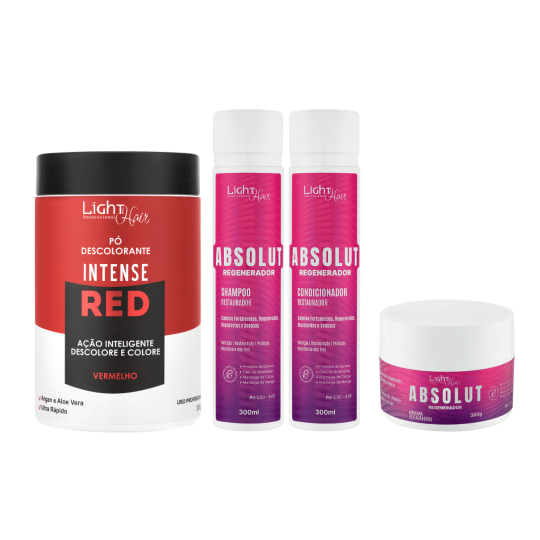 O Kit Pó Descolorante Intense Red + Absolut Regenerador Light Hair foi desenvolvido para proporcionar descoloração com tom vermelho intenso aliada a um tratamento completo de regeneração capilar. O Pó Descolorante Intense Red descolore os fios enquanto pigmenta para tons avermelhados, com ativos nanotecnológicos que reduzem o desgaste da fibra e preservam o brilho natural dos cabelos.